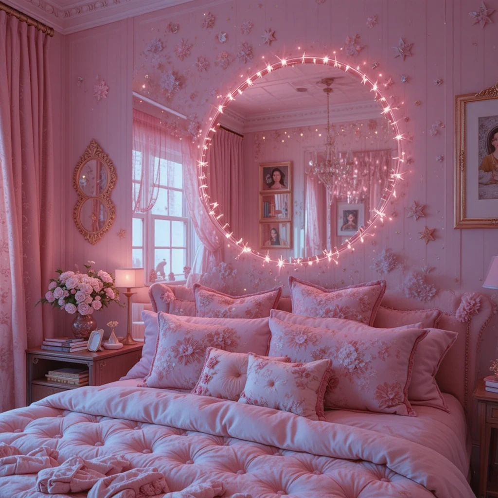Wrap your ceiling or canopy bed with delicate star string lights for a dreamy glow that feels like sleeping beneath a gentle night sky. The combination of pink tones and warm white light adds warmth and magic, making the entire space feel enchanted.