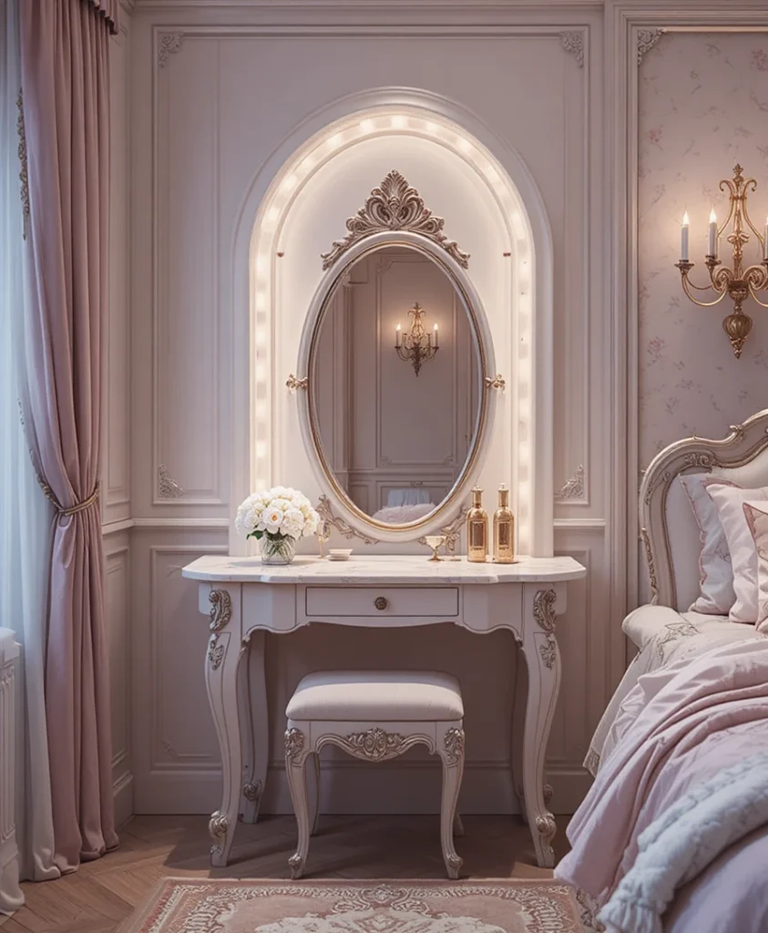 A small vanity with curved edges and soft lighting adds both function and fantasy. Princess bedroom ideas 2026 reinterpret vanities with minimalist designs, ensuring they remain age-appropriate and timeless.