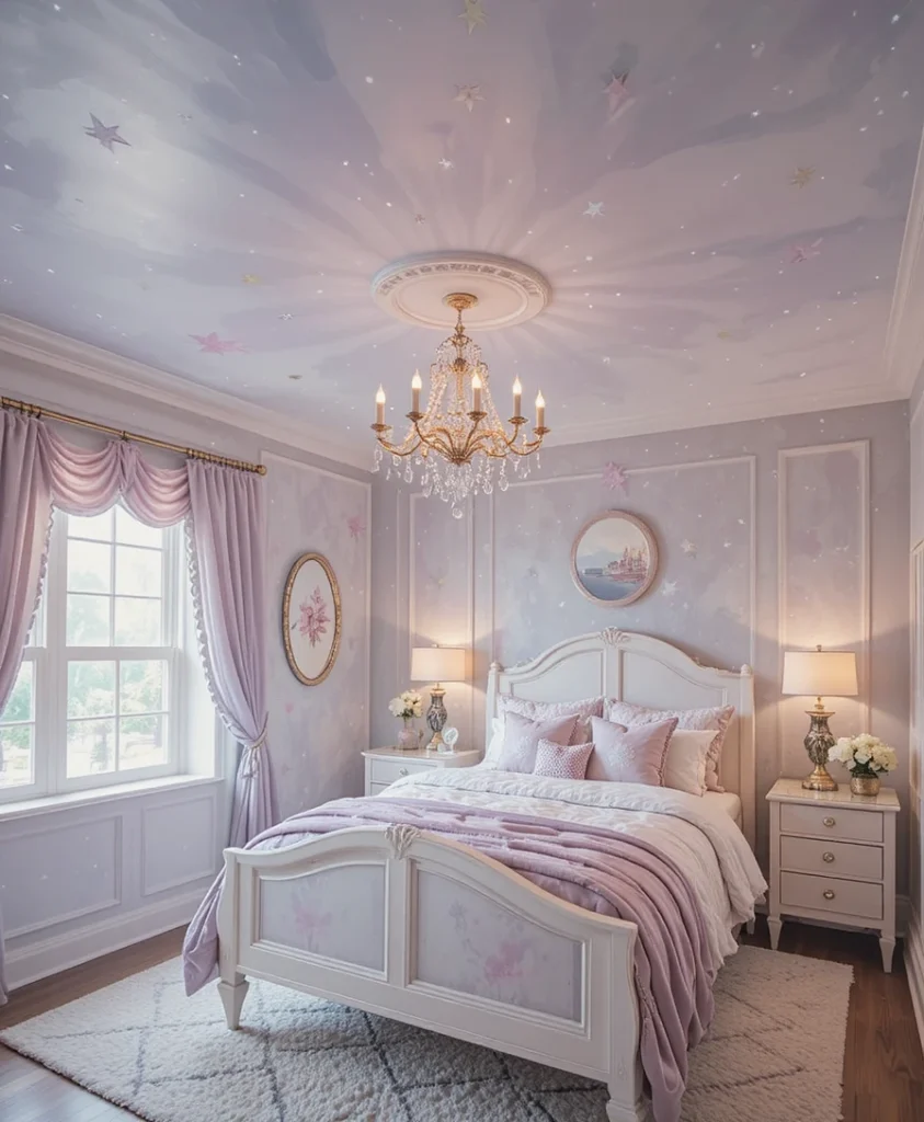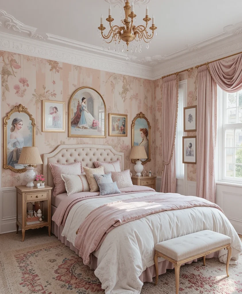 Pastels are reimagined in princess bedroom ideas 2026 through muted tones like dusty rose, pale sage, and warm lilac. These colors create a calming environment while subtly referencing classic royal interiors. Matte finishes and layered textures keep the look elegant rather than overly playful.