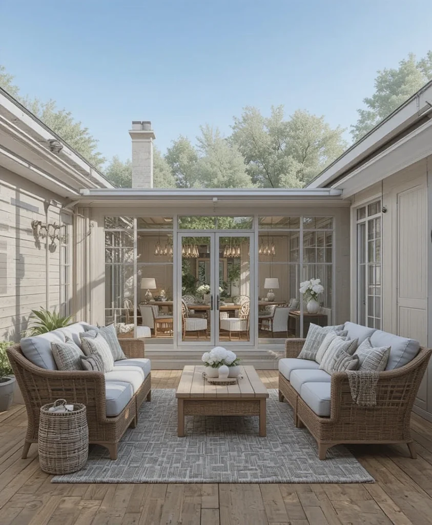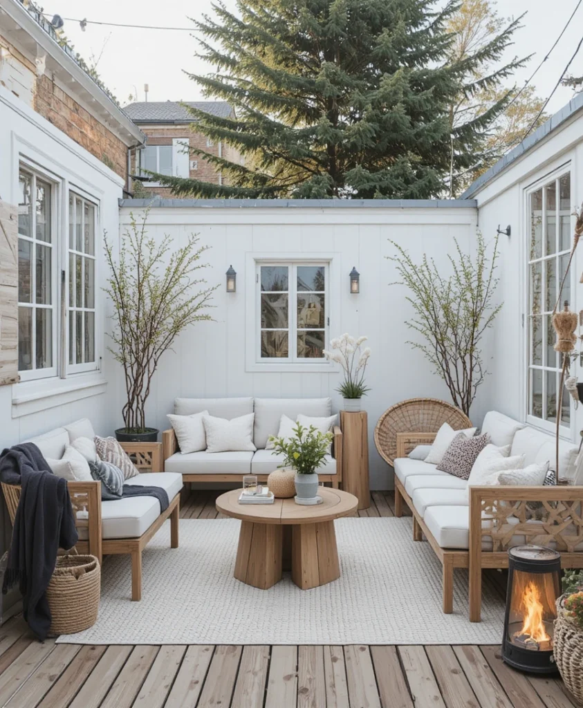 I always lean toward whites, greys, and earthy tones when designing Scandinavian Outdoor Spaces. These colors reflect natural light beautifully. To avoid a cold look, I layer textures—linen cushions, wool blankets, and woven rugs—creating a space that feels soft and inviting.