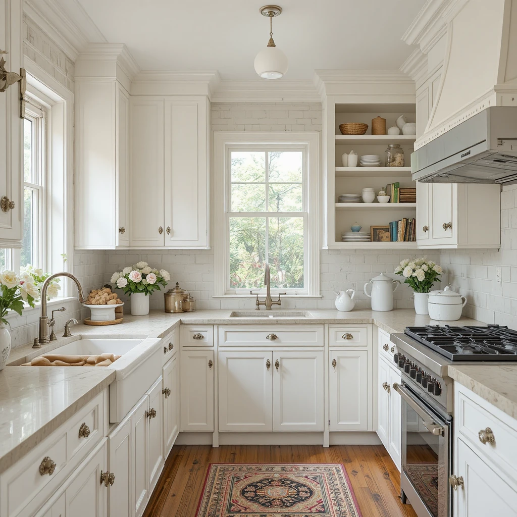 White cabinetry paired with vintage handles and open shelving defines a shabby chic kitchen. This combination balances functionality with old-world charm, creating a welcoming and practical space.