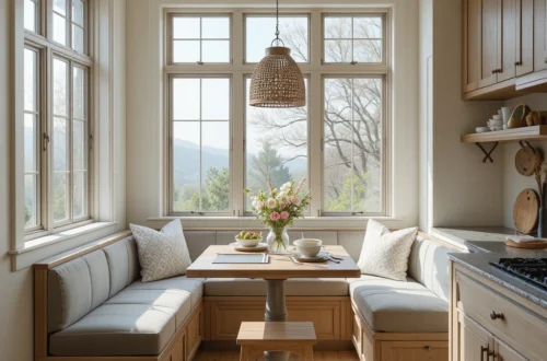 Instead of a traditional dining table, a built-in banquette or fold-down counter enhances a small kitchen remodel. These compact dining solutions add comfort without overwhelming the space and often include hidden storage beneath seating.