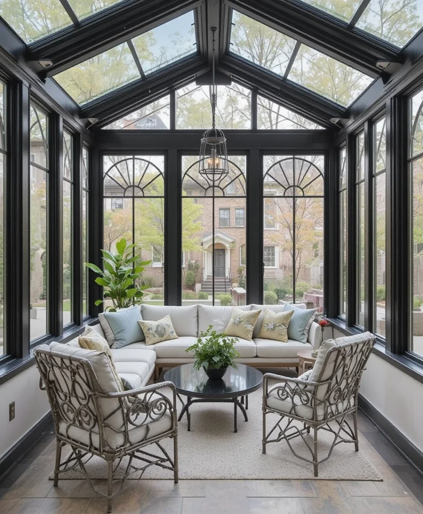 Black window frames create a striking contrast and modern appeal. Pair them with light interiors to maintain brightness. This bold yet refined look is trending strongly in small sunroom ideas 2026 for urban homes.