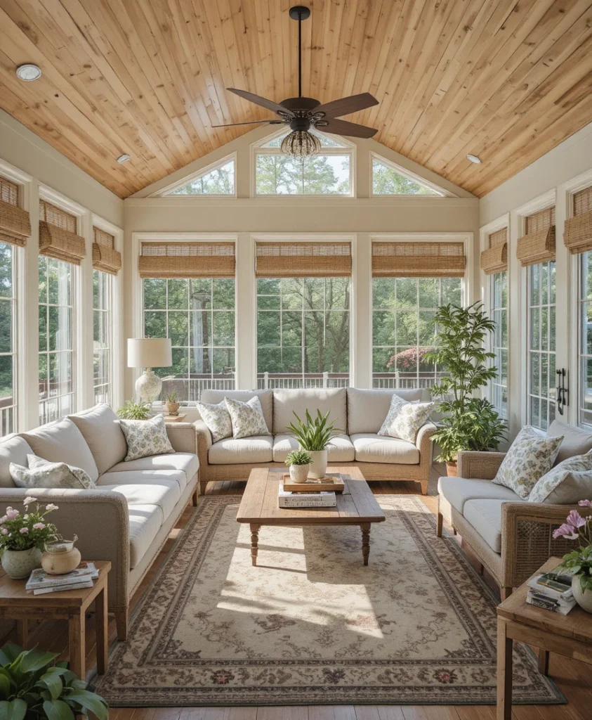 Design your sunroom as a casual family hangout. Use durable fabrics, rounded furniture, and soft rugs. The space remains stylish yet practical for daily use. This approach makes the sunroom welcoming for all ages.