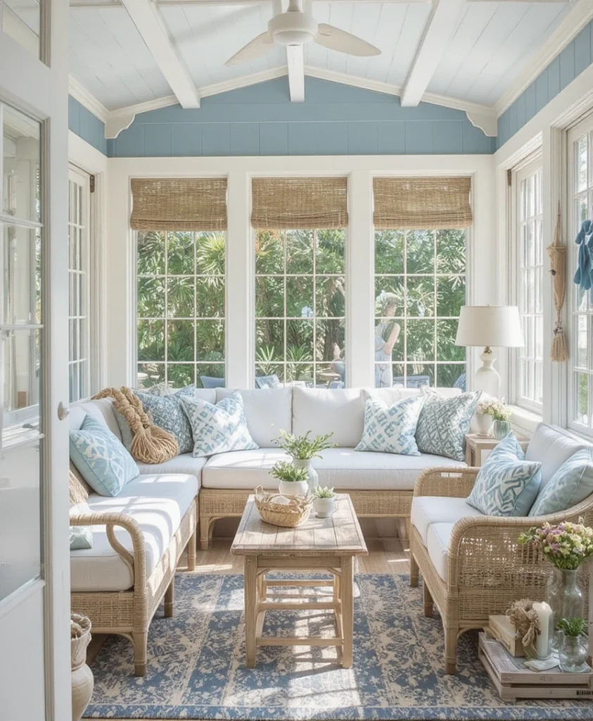 Coastal elements such as soft blues, whites, and natural fibers make small sunrooms feel breezy. Add subtle nautical décor for charm. This refreshing concept aligns perfectly with relaxed small sunroom ideas 2026.