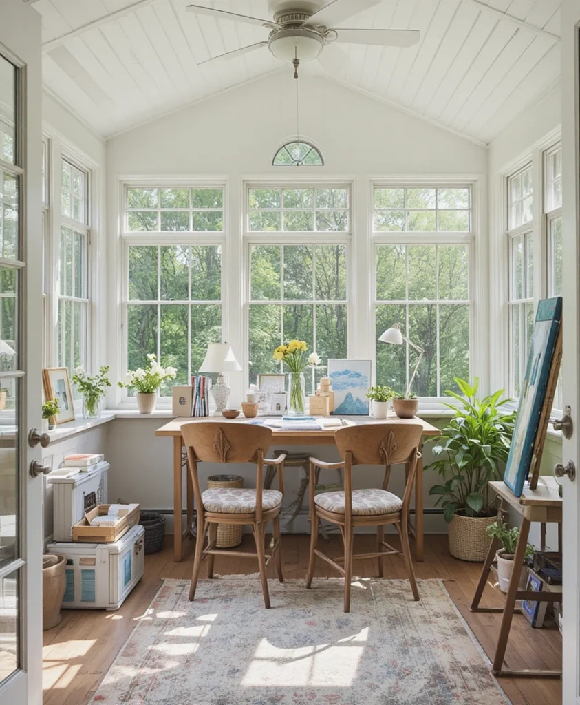 Use your sunroom as a creative studio for painting or crafting. Natural light enhances creativity, while compact storage keeps supplies organized. This idea transforms a small space into an inspiring workspace.