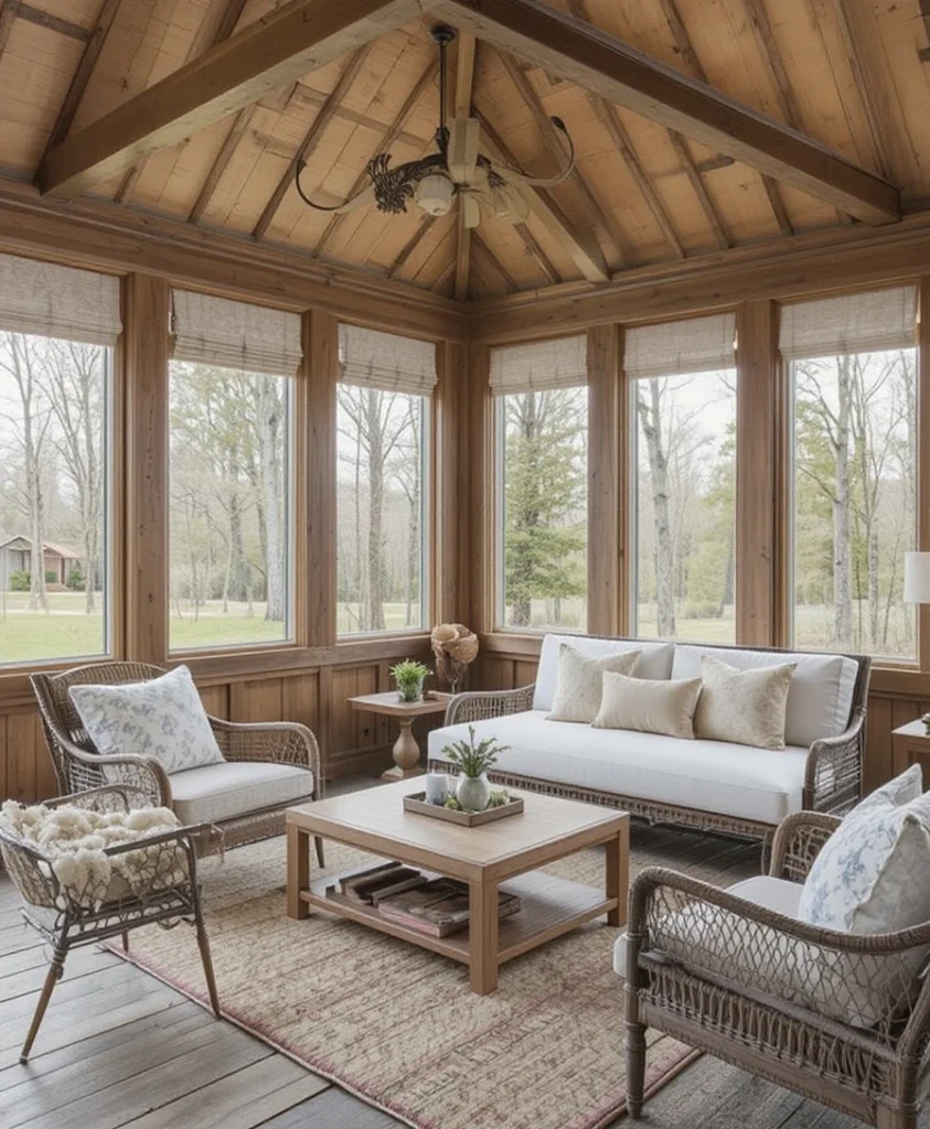 Wooden accents, exposed textures, and neutral tones create rustic charm. Pair with simple furnishings to prevent heaviness. Rustic small sunroom ideas 2026 balance coziness with openness beautifully.