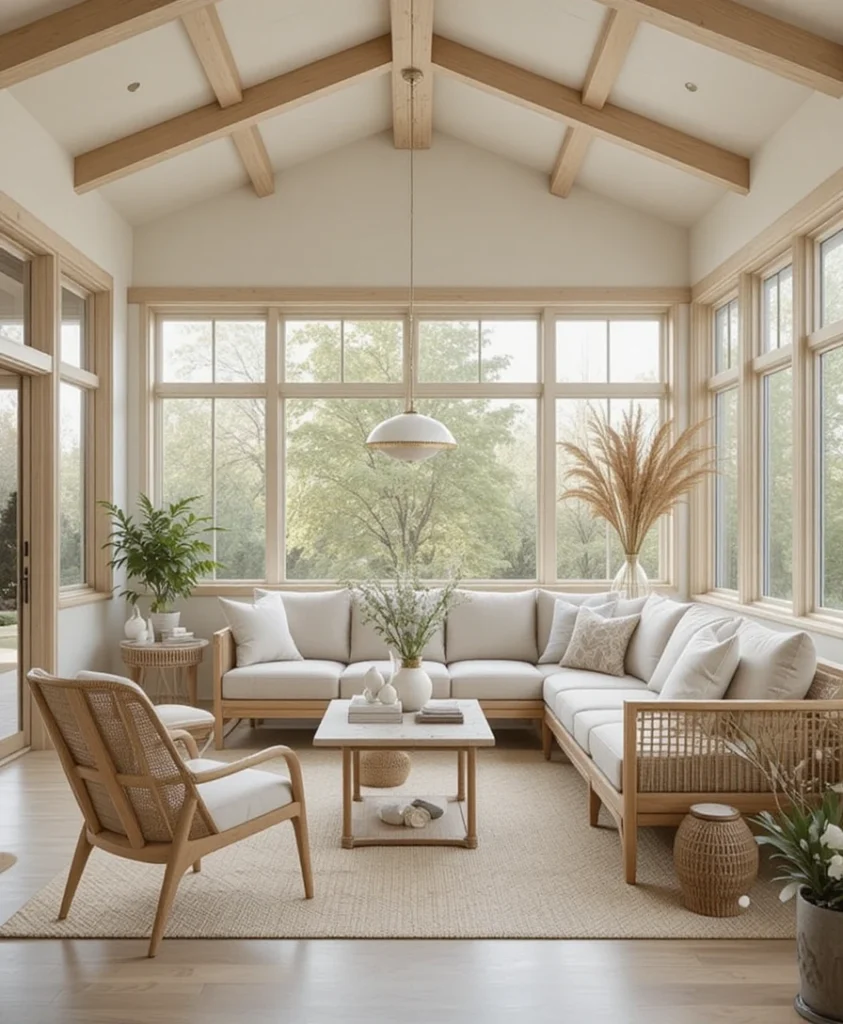 Japandi design combines Japanese minimalism with Scandinavian warmth. Clean lines, natural materials, and muted colors define this look. It’s a refined choice for modern small sunroom ideas 2026.