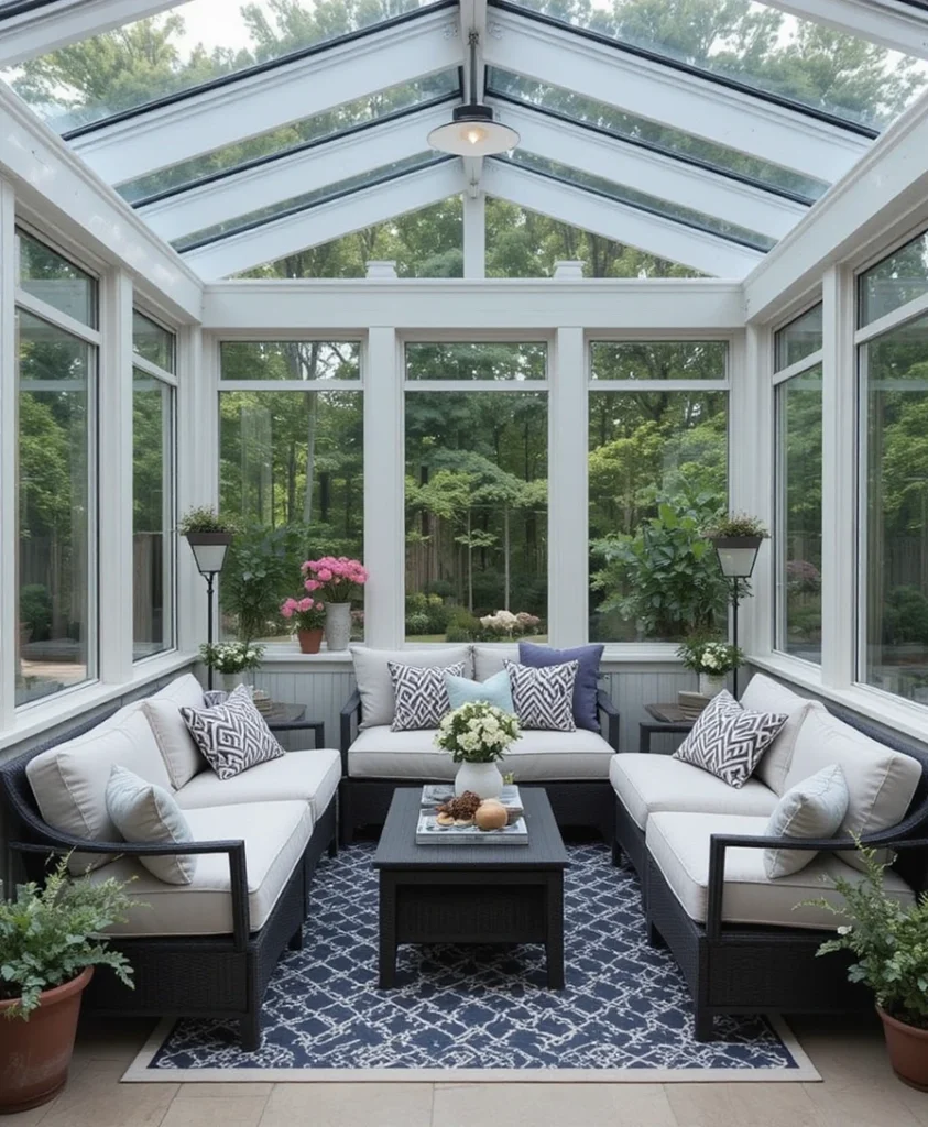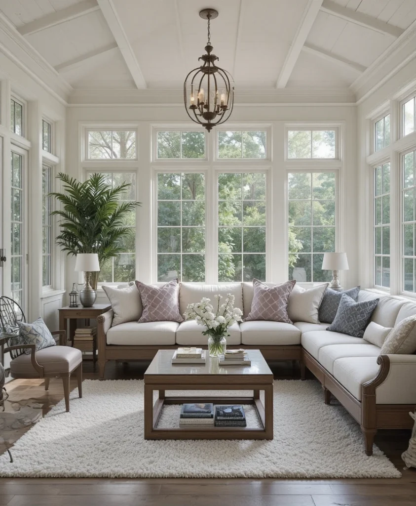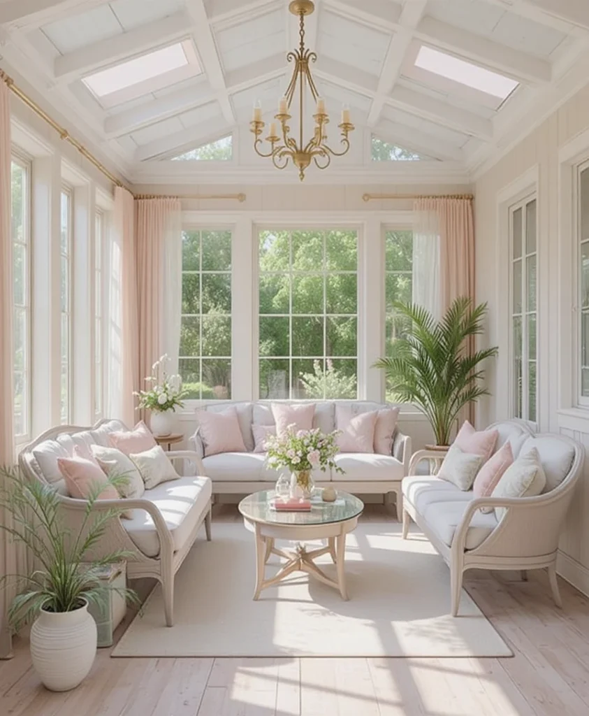 Pastel hues like blush, mint, or lavender add subtle color without overpowering the space. Pair with light furniture and sheer curtains. This creates a delicate, stylish sunroom atmosphere.