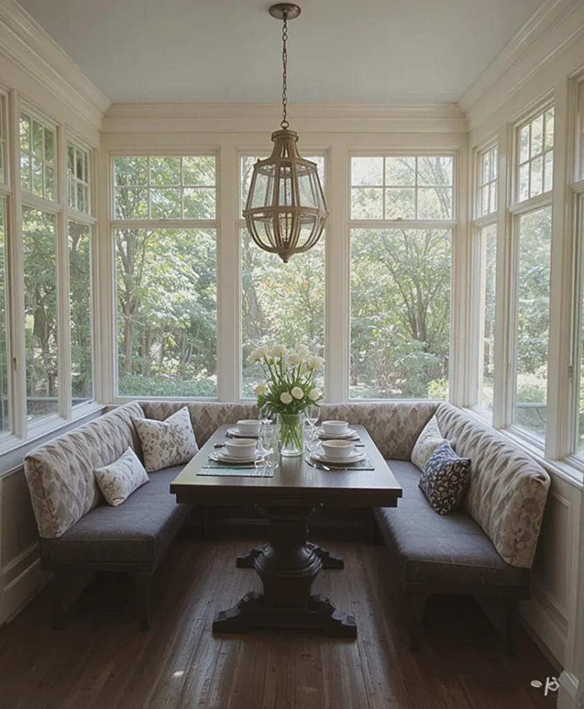 Extend your dining area into the sunroom with a slim table and bench seating. Natural light enhances meals and gatherings. This idea works well for homes lacking large dining spaces.