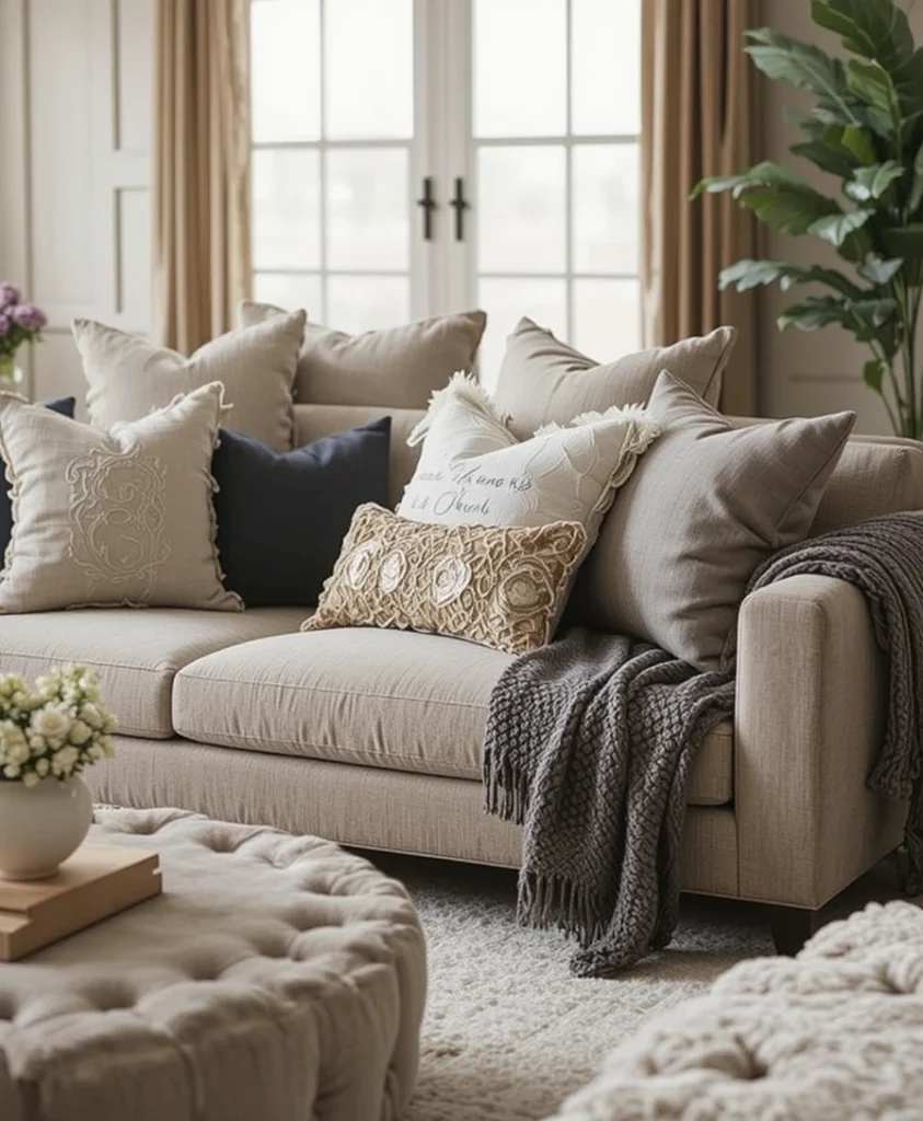 13. Layered Sofa Styling with Cushions and Throws