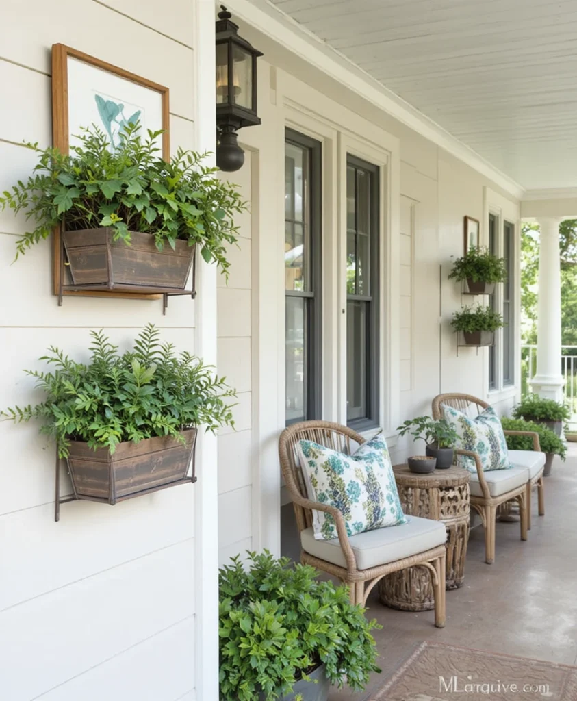 Wall-mounted planters or botanical signs enhance spring porch decor without taking floor space. These elements add interest to bare walls or columns. Greenery on vertical surfaces feels fresh and modern. It completes the overall look.