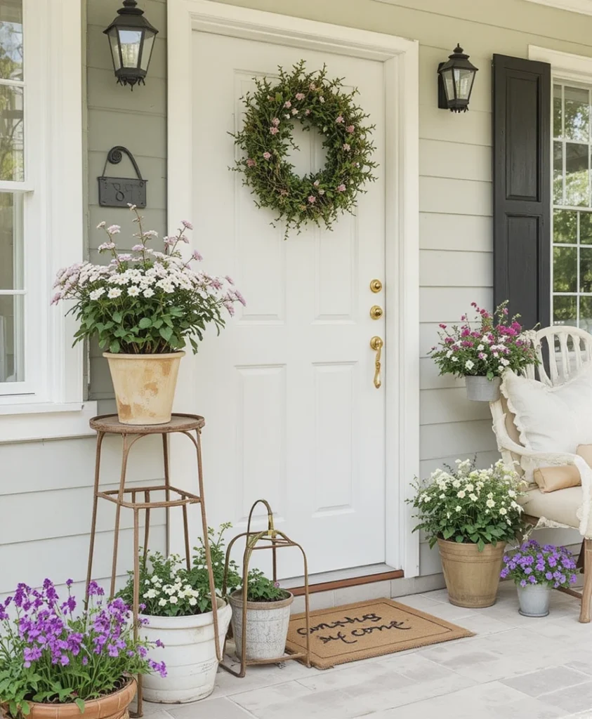 Symmetry brings instant elegance to spring porch decor. Matching planters or lanterns on either side of the door feel intentional and welcoming. This structured approach suits classic and modern homes alike. It creates visual calm.