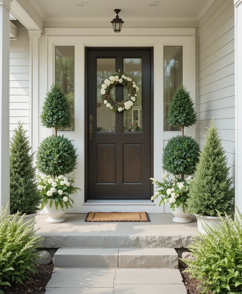 For a clean aesthetic, minimalist spring porch decor focuses on simple greenery and neutral tones. Choose structured plants like boxwood or olive trees. Fewer elements allow each piece to stand out. This style feels fresh and uncluttered.