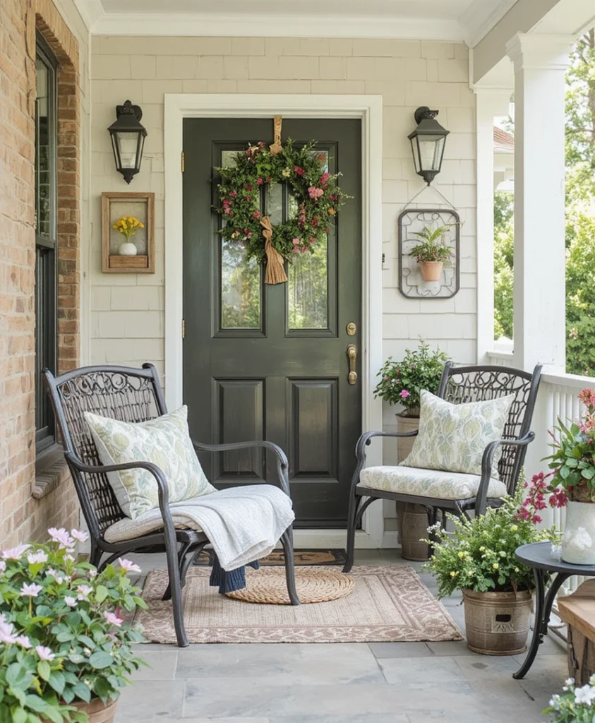 Create a small seating nook to complete your spring porch decor. A chair, side table, and soft throw invite relaxation. This transforms the porch from decorative to functional. It becomes a space to truly enjoy the season.