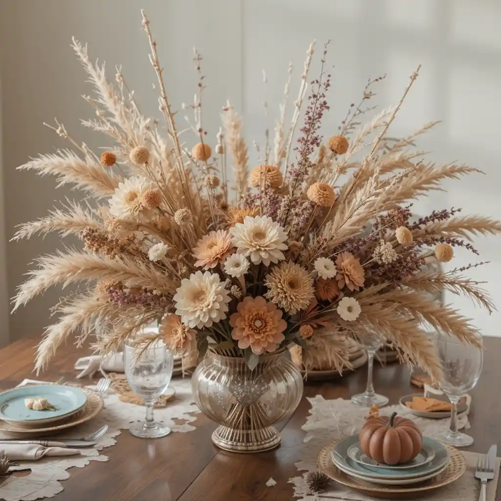 Swap fresh flowers for dried florals or pampas grass arrangements for a trendy, boho-inspired Thanksgiving centerpiece.