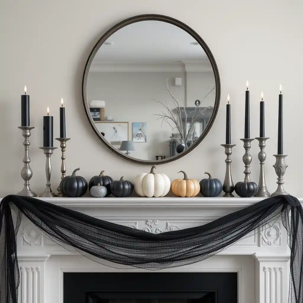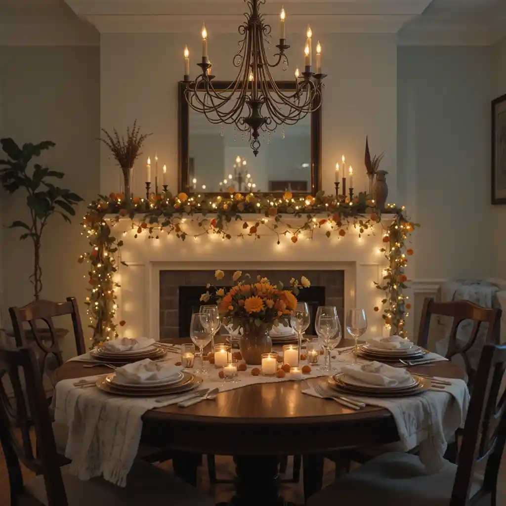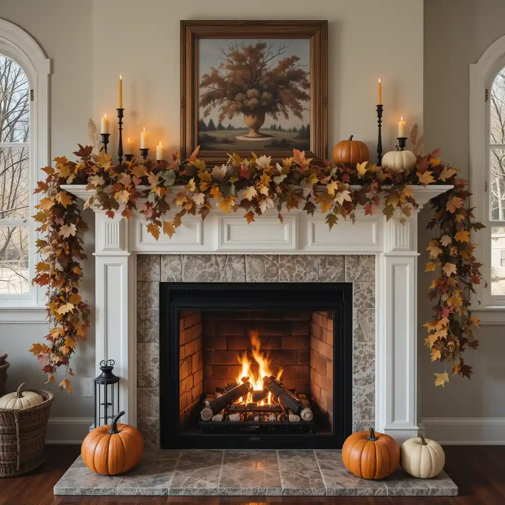 Adorn your mantel with garlands, candles, and seasonal leaves to make your fireplace the heart of Thanksgiving celebrations.