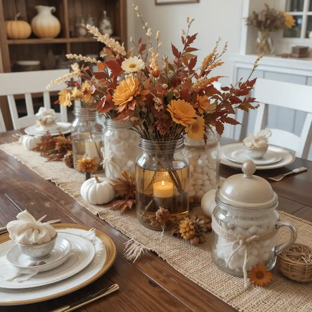Decorate with mason jars, burlap runners, and wooden crates to give your Thanksgiving a cozy farmhouse aesthetic.