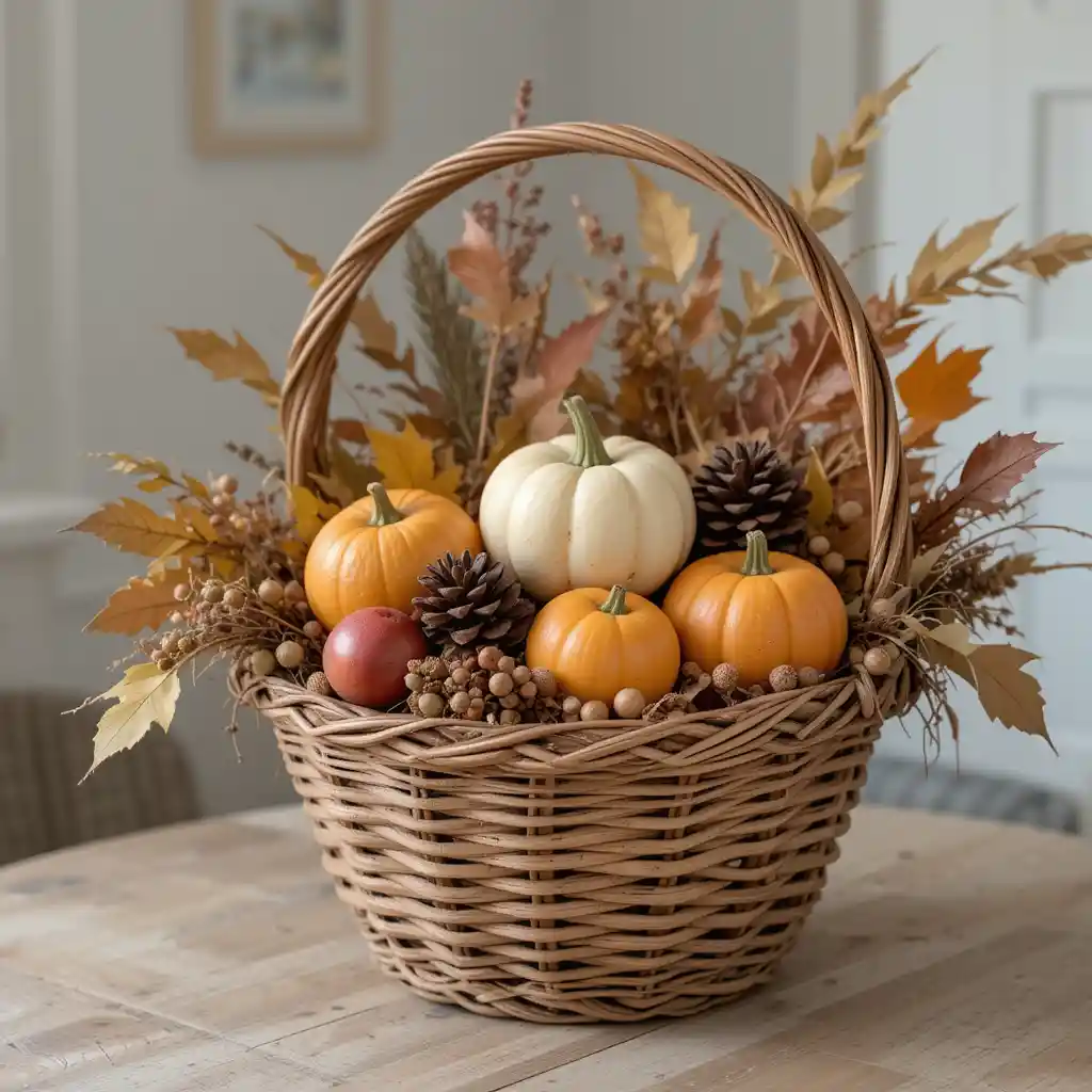 Fill a woven basket with seasonal fruits, gourds, and pinecones to create a natural and rustic Thanksgiving display.