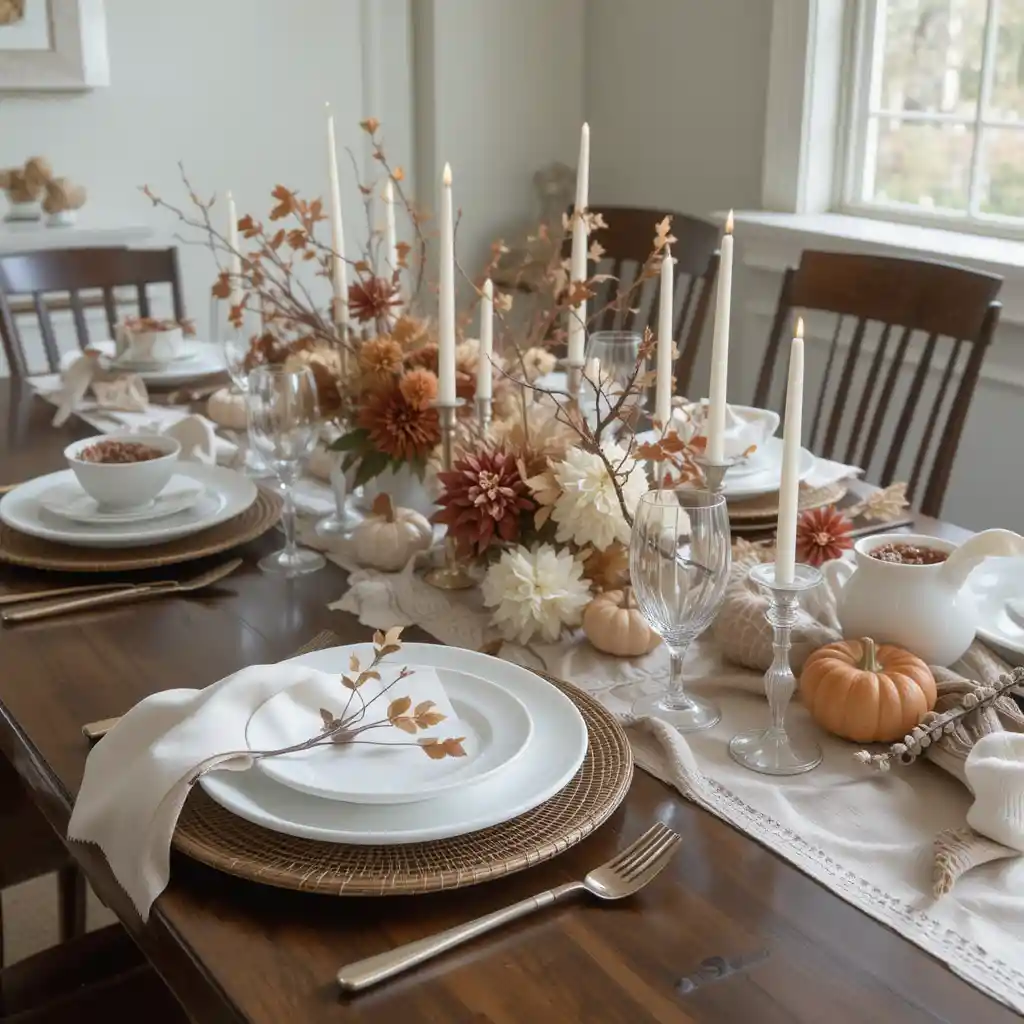 Go for a simple centerpiece with neutral tones and uncluttered arrangements for a sleek, modern Thanksgiving aesthetic.