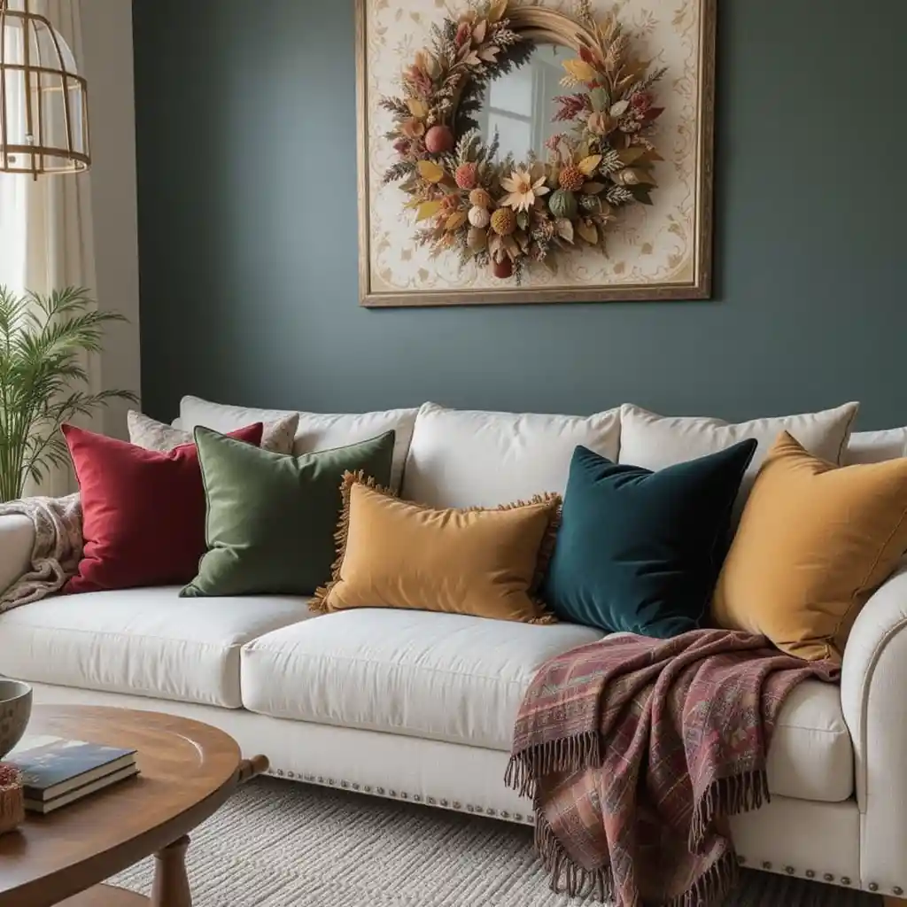 Switch out your regular cushions for velvet pillows in autumn shades like mustard, burgundy, and deep green to add instant coziness.