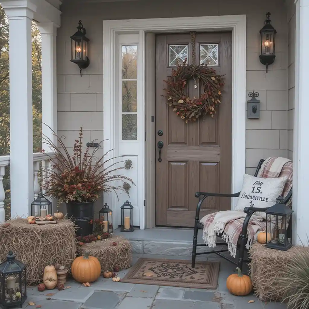 Extend the holiday spirit outdoors with lanterns, hay bales, and cozy blankets for a rustic Thanksgiving porch or patio look.