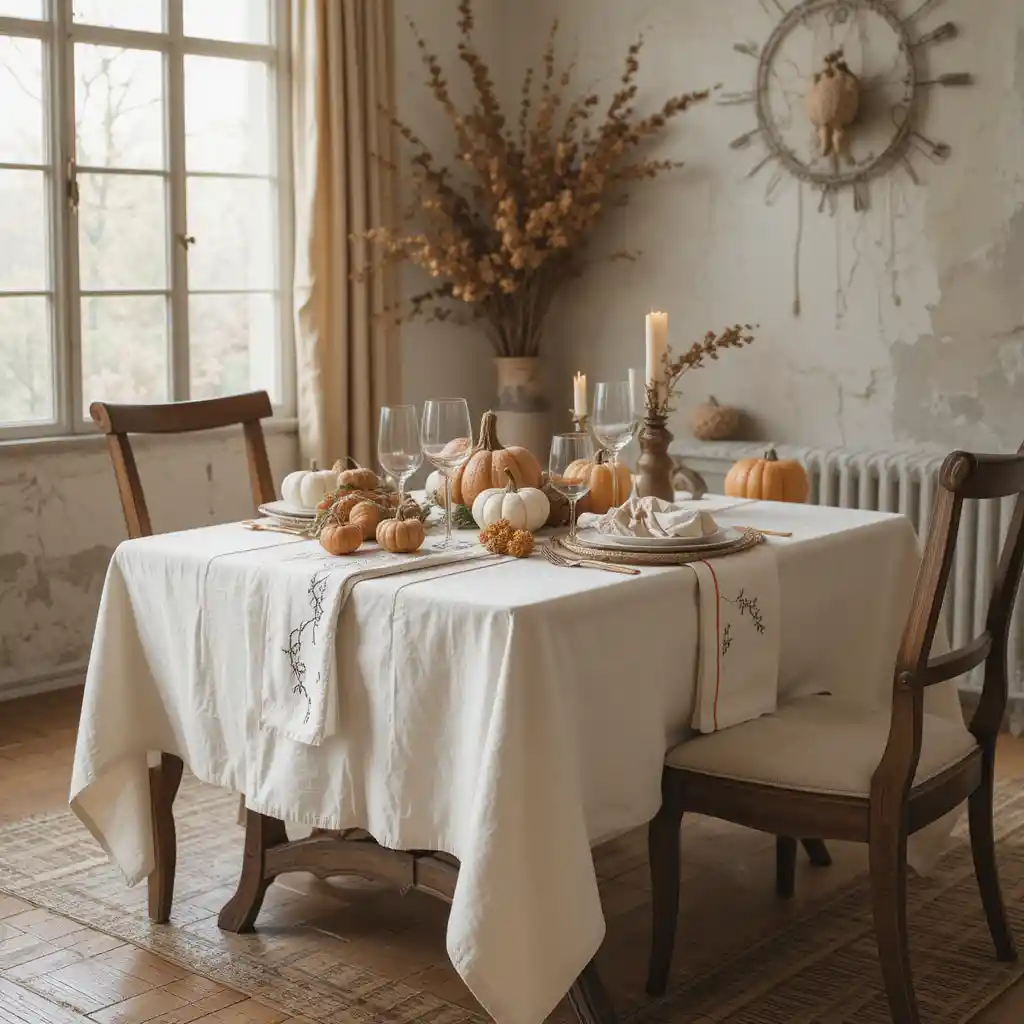 Choose a cream or earthy linen tablecloth for a clean, timeless, and cozy Thanksgiving look that works well with any décor style.