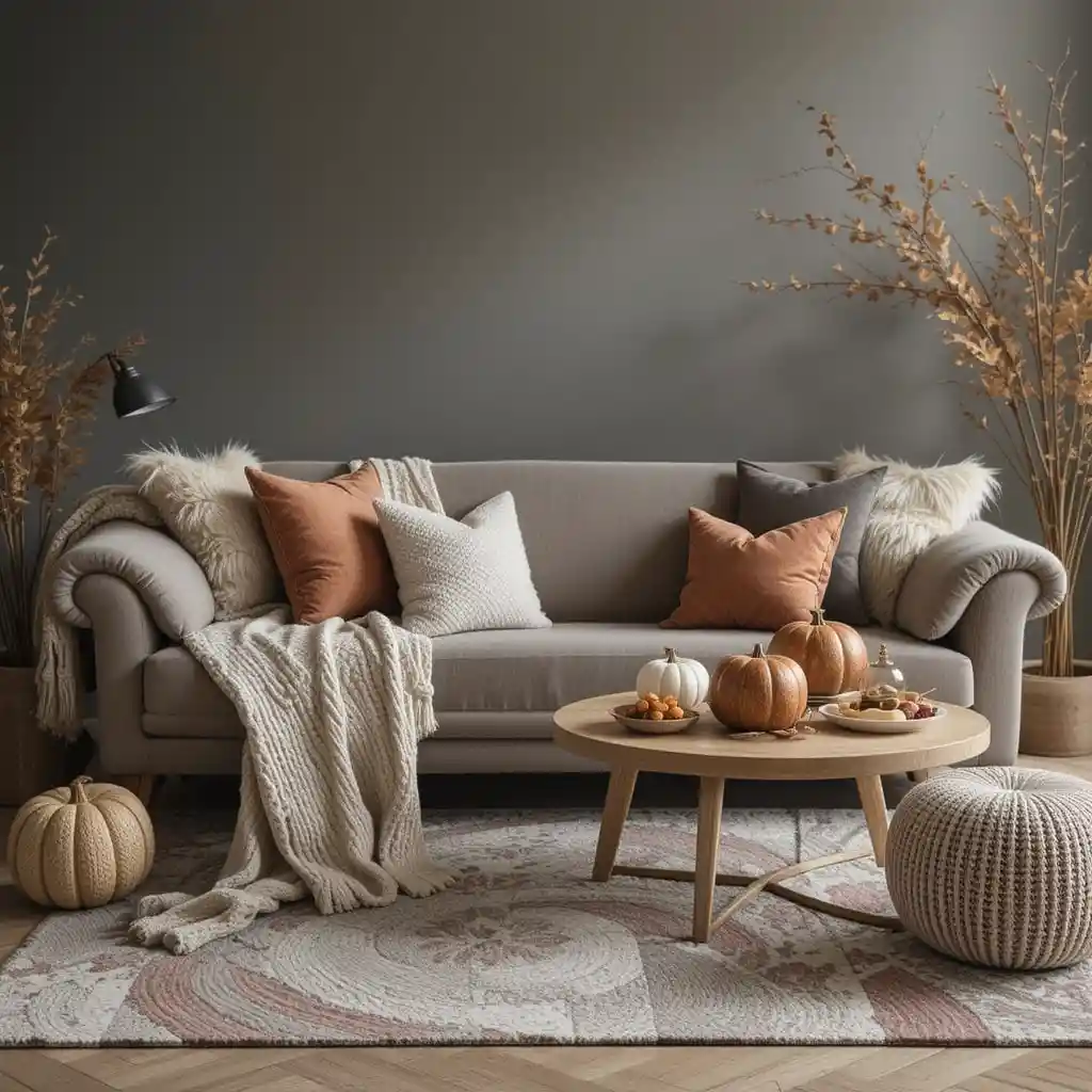 Mix knit throws, velvet cushions, and soft rugs in your living space to create a layered, inviting Thanksgiving environment.