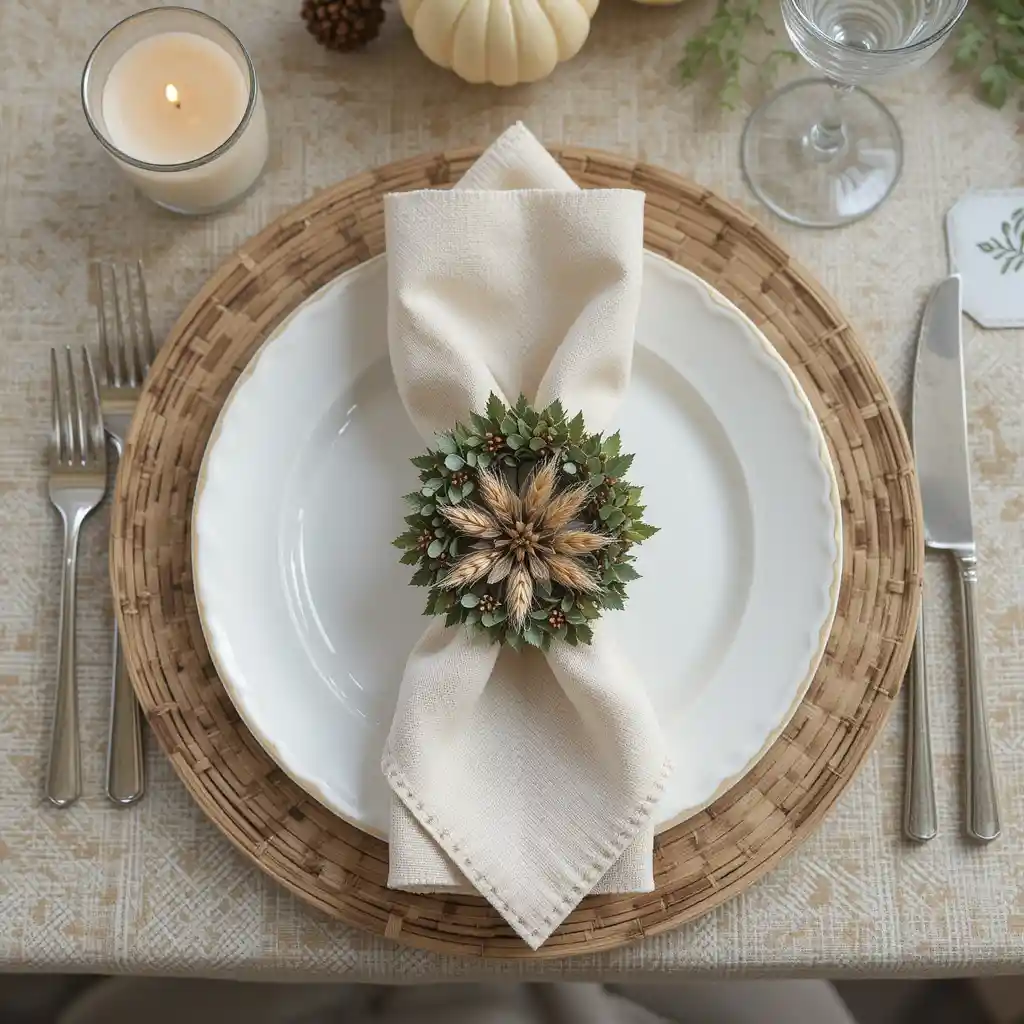 Tie a small greenery or wheat wreath around napkins to act as a unique and festive place setting that doubles as a keepsake.