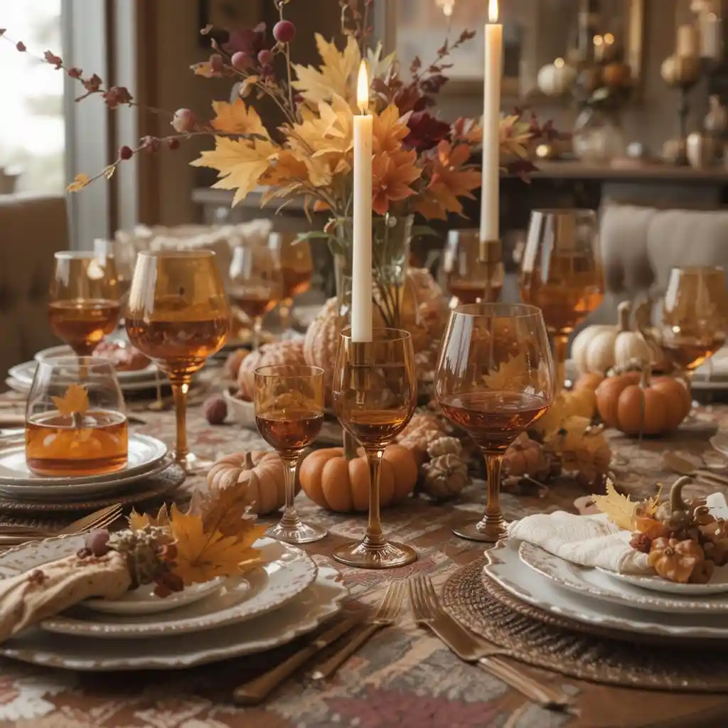 Use warm-toned candles in gold or amber holders to create a soft glow across your dining table or mantel. Candlelight instantly adds a magical Thanksgiving atmosphere.