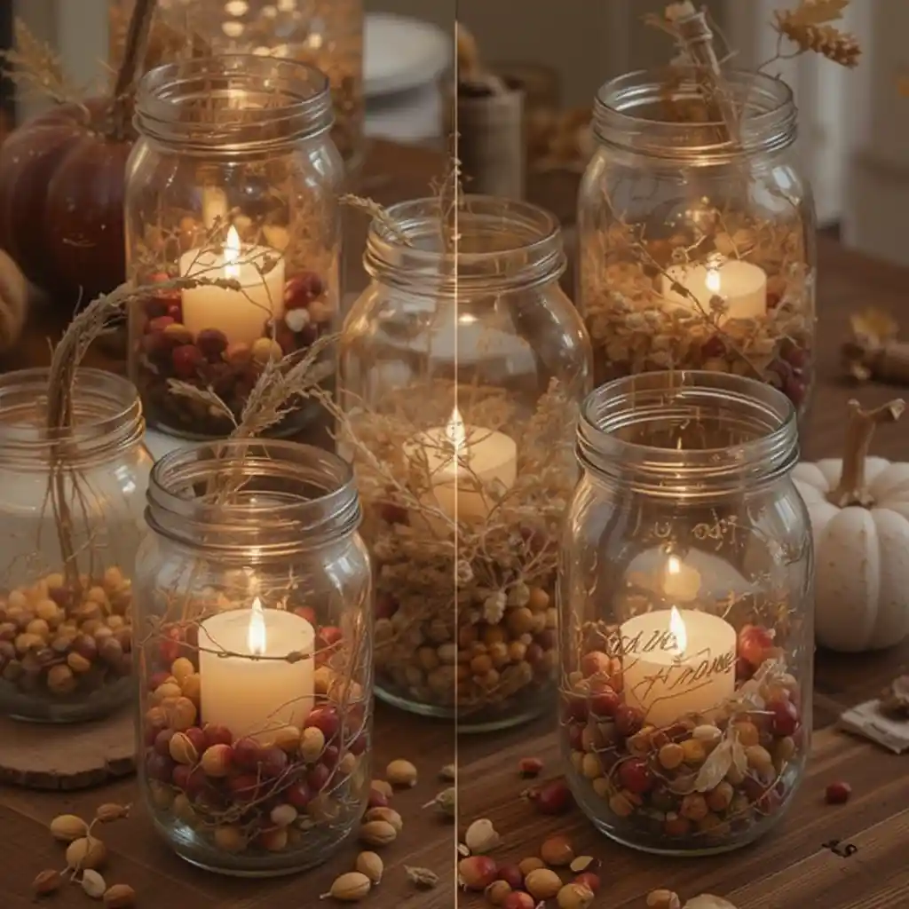 Turn simple mason jars into candle holders by filling them with cranberries, acorns, or corn kernels. This DIY touch creates rustic charm while glowing softly indoors.