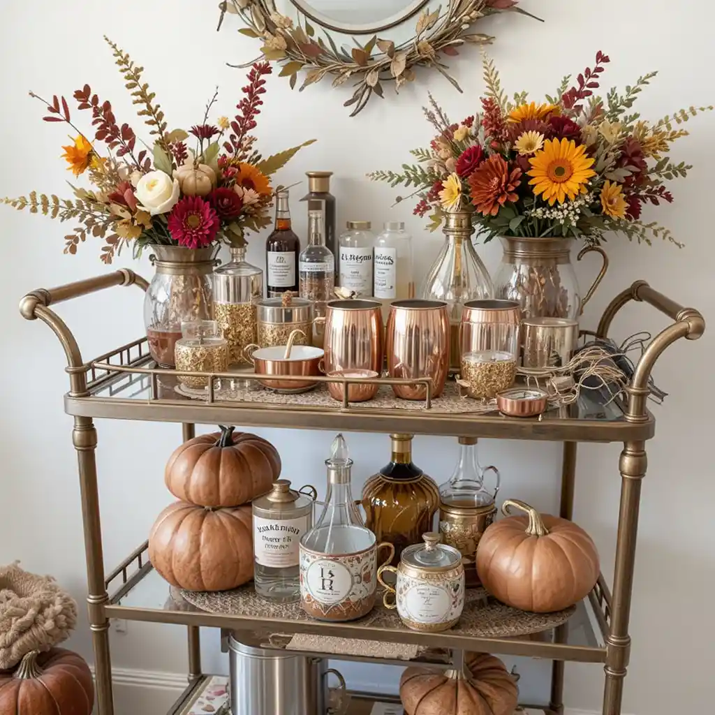 If you have a bar cart, decorate it with festive glasses, copper mugs, and seasonal florals. It doubles as both a functional drink station and a stylish indoor display.