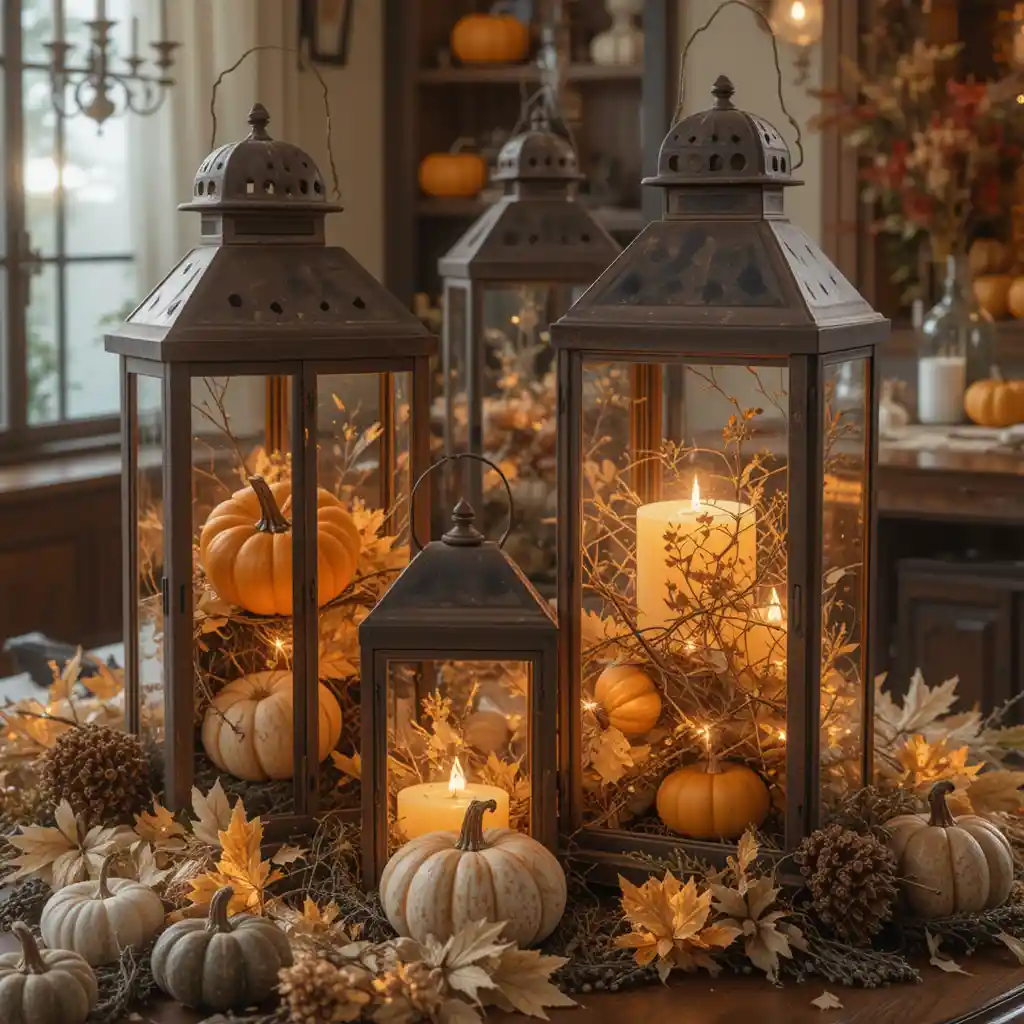 Place pumpkins or gourds inside large lanterns instead of candles. This creative twist gives your indoor decor a unique and cozy holiday feel.