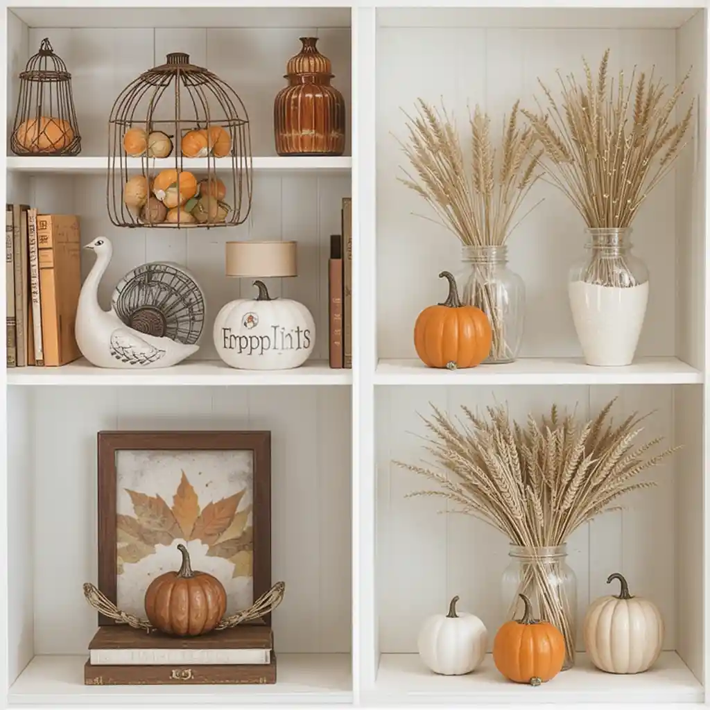 Refresh your bookshelves or open shelves by mixing in seasonal accents like ceramic turkeys, pumpkin figurines, or vases filled with wheat stalks. It’s an easy way to add holiday cheer without redecorating completely.