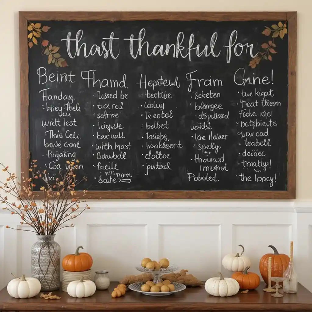 Set up a chalkboard wall or sign where guests can write what they’re thankful for. It serves as both decoration and a meaningful activity for the holiday.