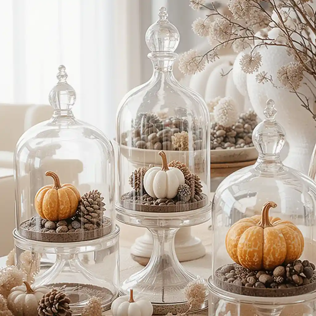 Use glass cloches to showcase small pumpkins, pinecones, or candles. These mini displays add elegance and elevate your Thanksgiving indoor decorations.