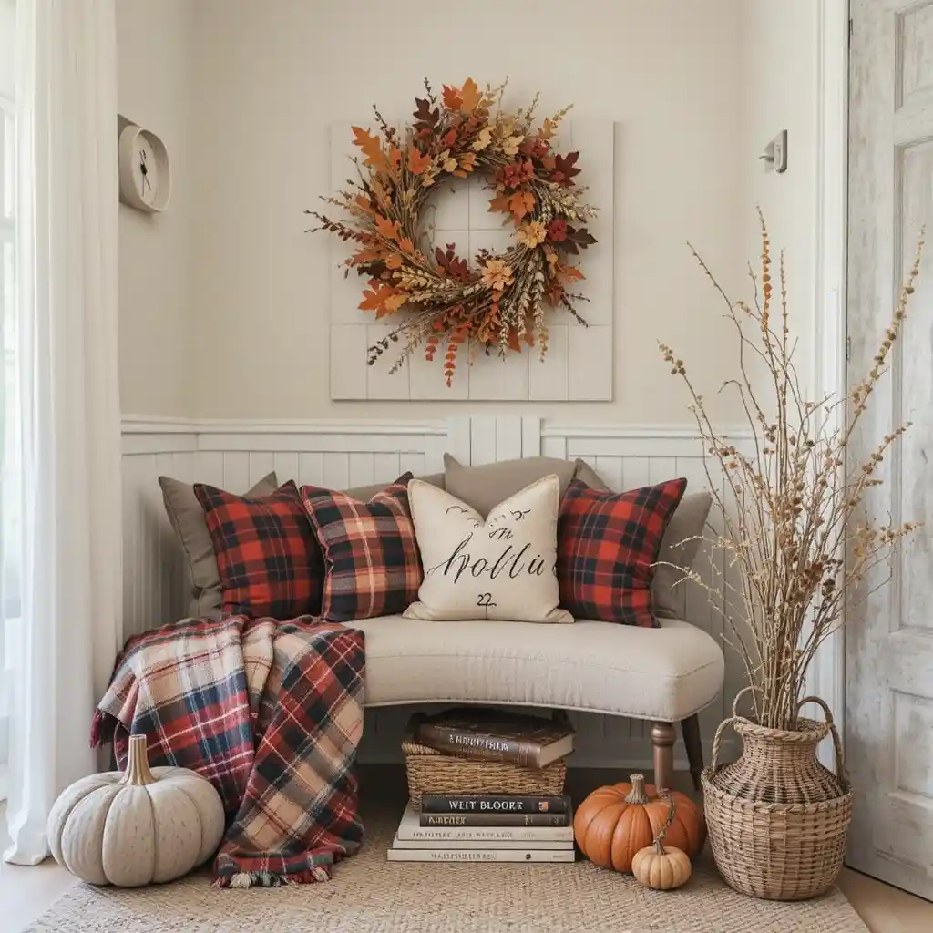 Greet your guests with a farmhouse-inspired entryway featuring a wooden bench, cozy plaid throws, and a basket filled with mini pumpkins. Adding a welcome sign with fall leaves instantly sets a festive tone.