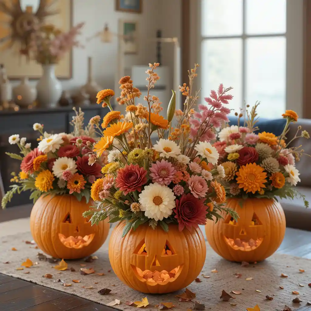 Carve out small pumpkins and use them as vases for fresh or faux fall florals. These creative arrangements serve as eye-catching indoor decorations that add charm to any room.