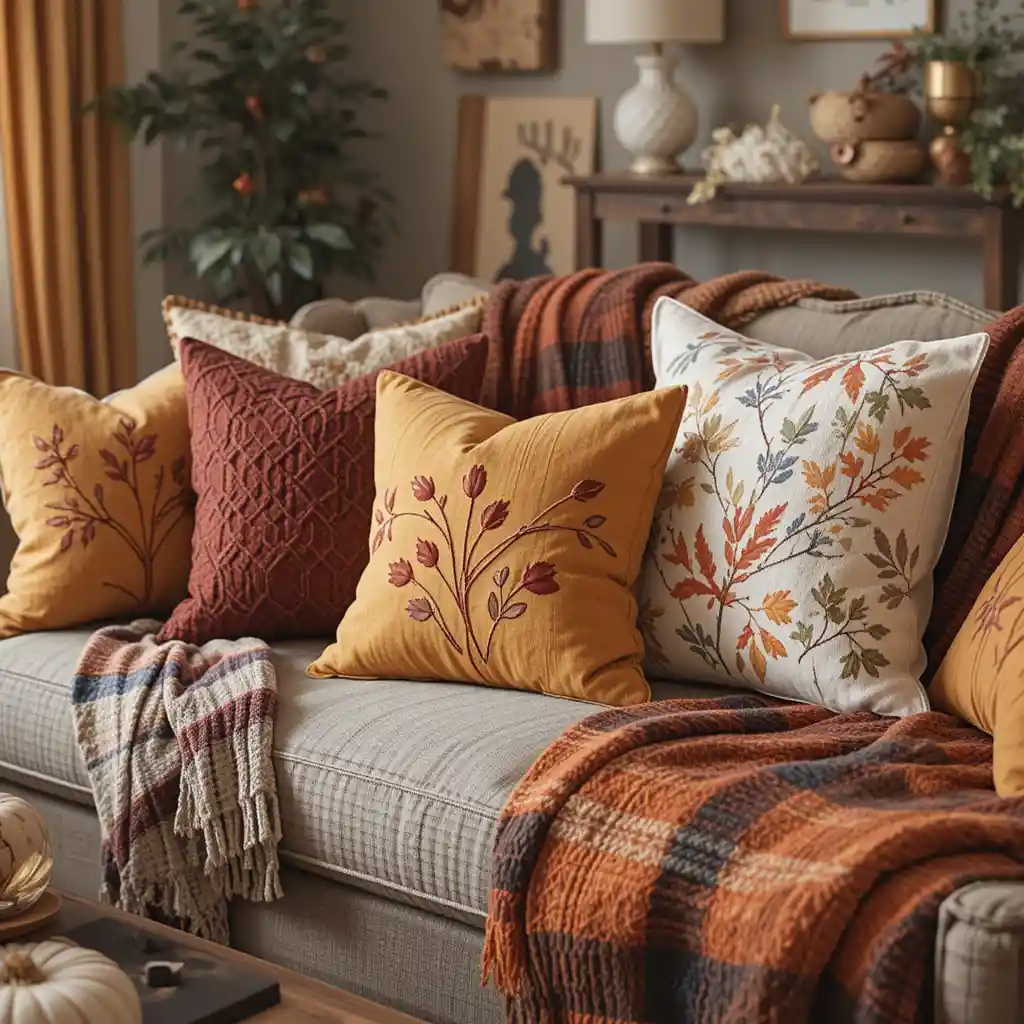 Add throw pillows in fall shades of mustard, burgundy, and burnt orange along with plaid blankets. These textiles bring warmth and comfort, perfect for family lounging on Thanksgiving Day.