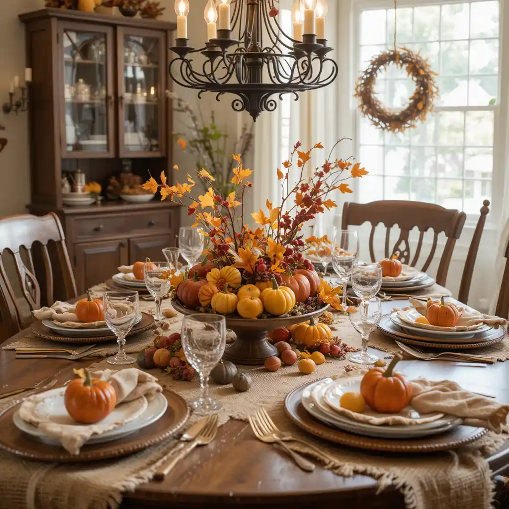 Create a harvest-style table with natural textures like burlap runners, wooden chargers, and centerpieces of seasonal fruits. It sets the perfect stage for your Thanksgiving feast.