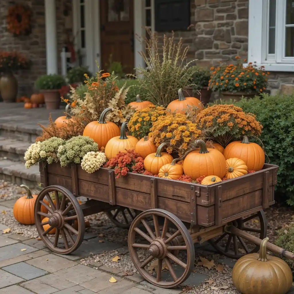 Style a vintage wagon filled with pumpkins and mums near your entrance. This nostalgic setup adds personality and charm to your outdoor Thanksgiving decor.