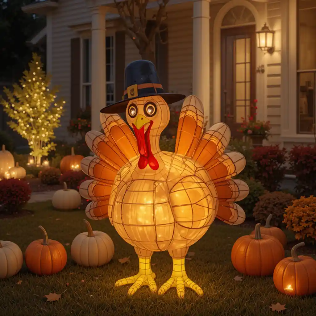 Add a festive touch with a light-up turkey decoration in your yard. It’s playful, fun, and instantly recognizable as a Thanksgiving symbol.