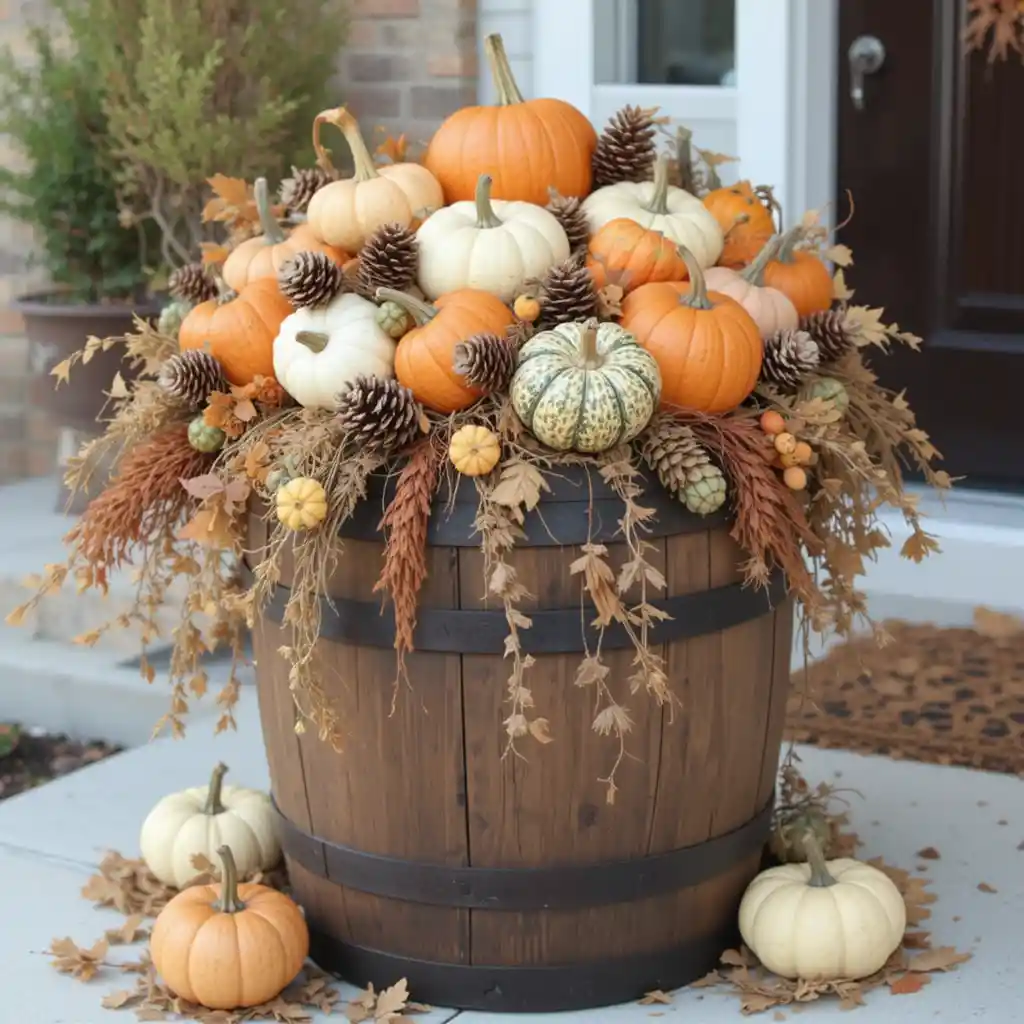 Repurpose a wooden barrel and fill it with gourds, pumpkins, and pinecones spilling out onto your porch. It gives a rustic farmhouse vibe that’s perfect for Thanksgiving.