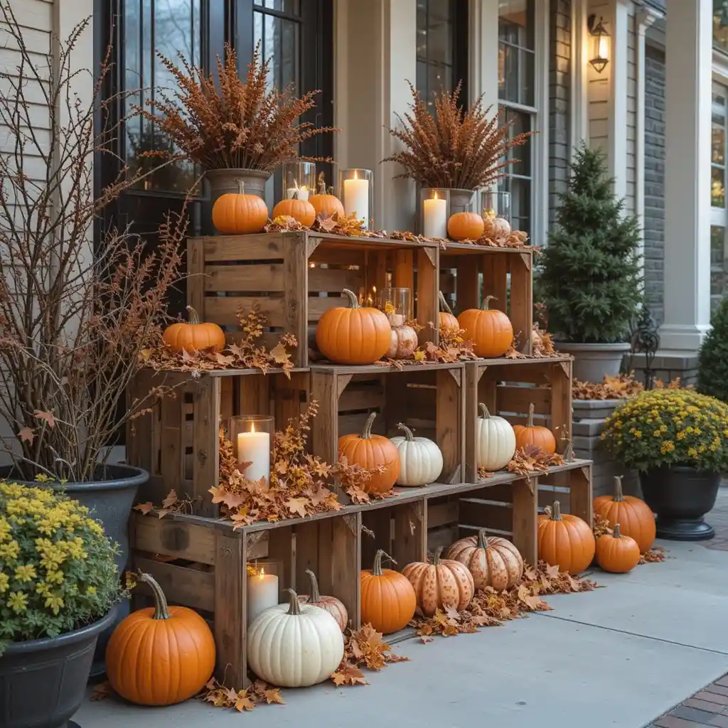 Stack wooden crates filled with pumpkins, candles, and leaves on your porch. Layering the crates at different heights creates depth and visual interest.