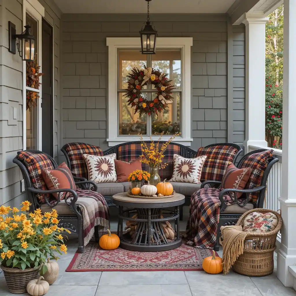 If you have a porch or patio, create a cozy seating nook with plaid throws, fall pillows, and a small table decorated with pumpkins. It’s perfect for sipping cider outdoors.
