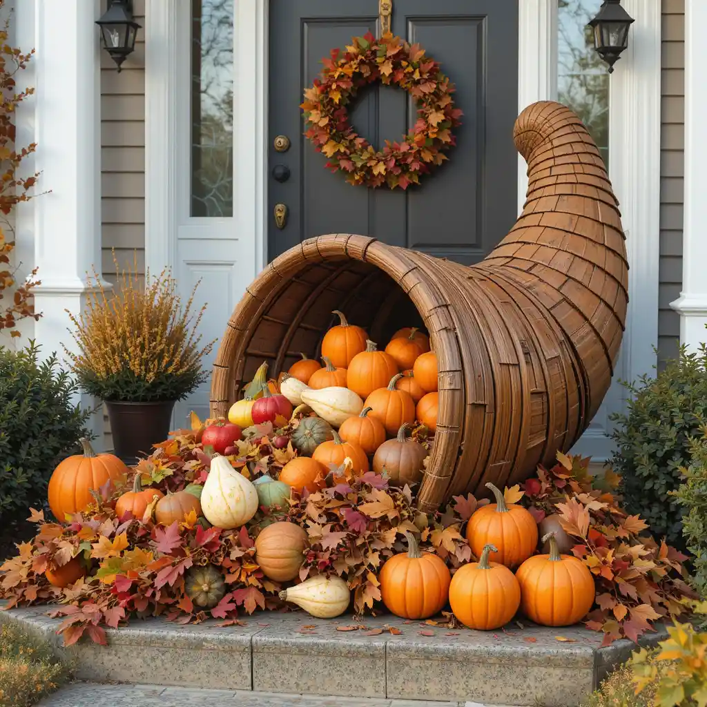 Set up a large cornucopia overflowing with gourds, apples, and autumn leaves at your doorstep. This traditional symbol of abundance makes a powerful seasonal statement.