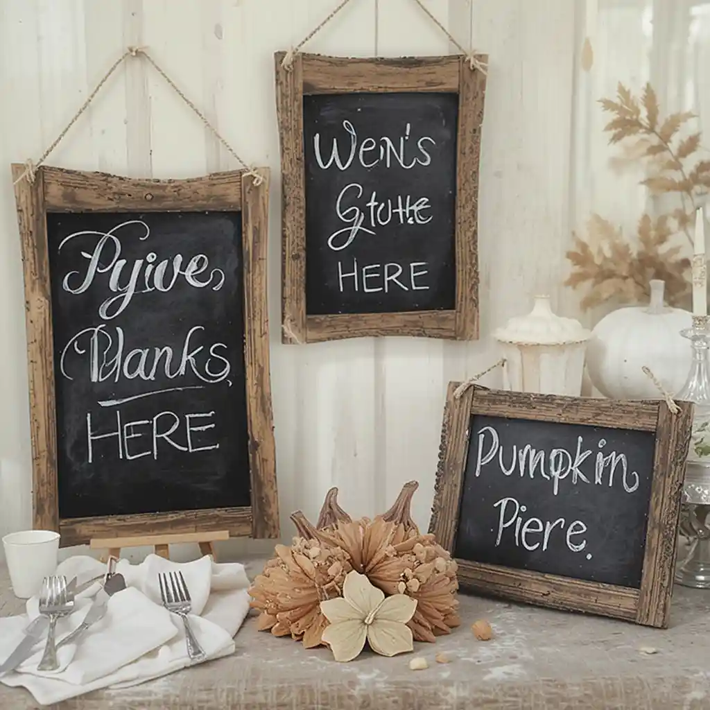 Add chalkboard signs with handwritten messages like “Give Thanks” or “Pumpkin Pie Here.” They guide guests while also enhancing farmhouse-style decor.
