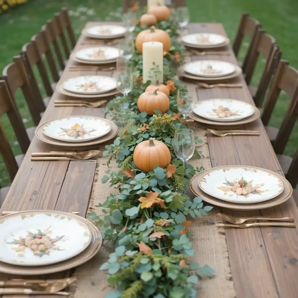 Cover your tables with burlap runners layered with seasonal greenery. This raw texture adds rustic character and perfectly suits an outdoor setup.