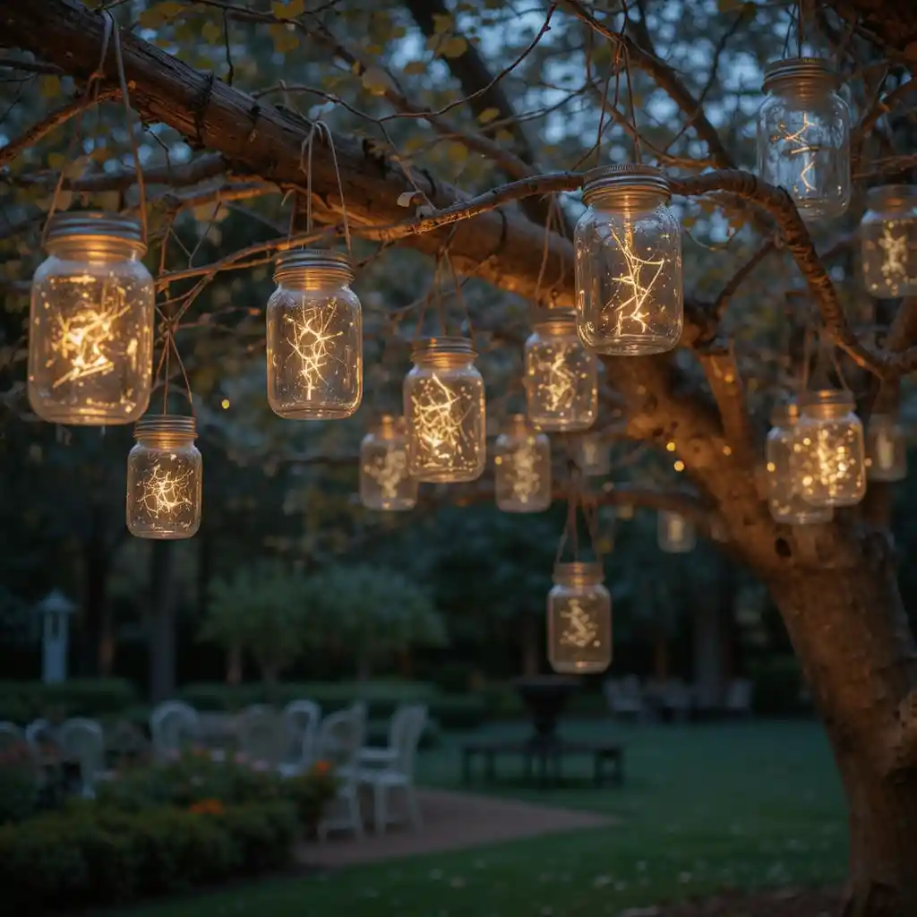 Hang mason jars filled with tea lights or fairy lights from tree branches. These glowing jars create a romantic farmhouse effect for your evening.