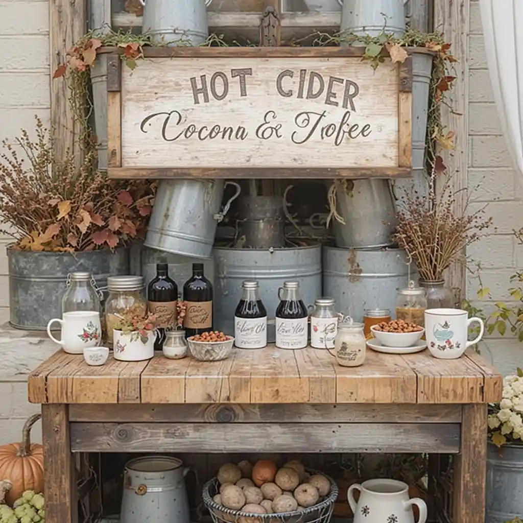 Set up a station with hot cider, cocoa, and coffee. Use galvanized buckets, mugs, and seasonal signage for a welcoming farmhouse-inspired bar.